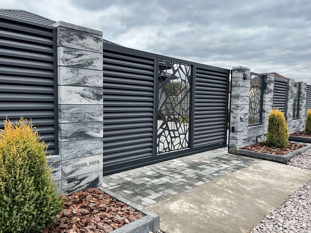 Жалюзи — состоит из горизонтально расположенных ламелей (реек), установленных под наклоном. Эта конструкция обеспечивает эстетичный внешний вид, защиту территории и отличную вентиляцию, при этом сохраняя приватность.